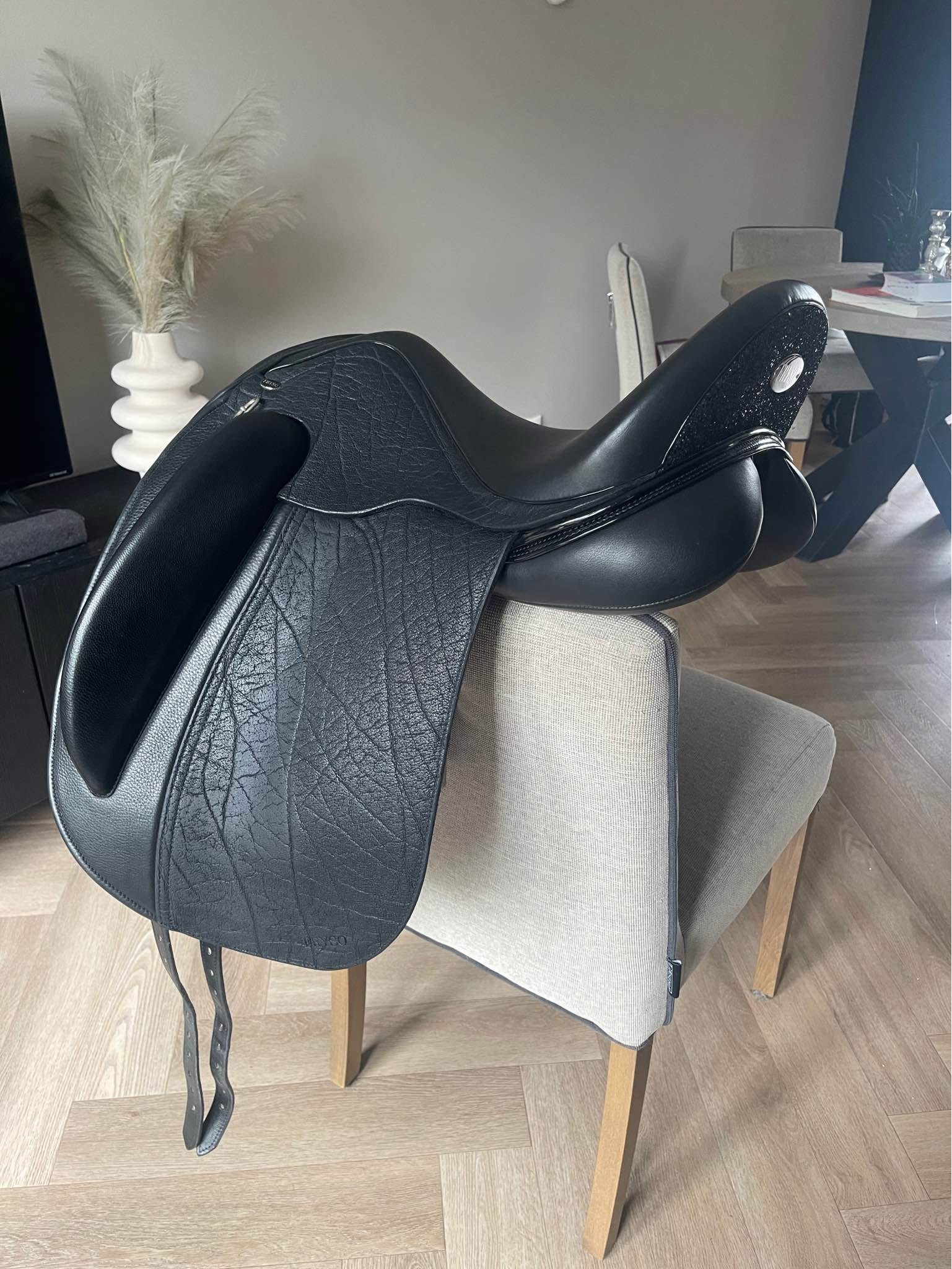 Prachtig nieuw Fryso Legacy Mono dressuurzadel 17 inch met boommaat W. In december ‘23 nieuw gekocht bij Tweespan. Dressuurzadel van zwart buffelleer, lakbiezen voor en achter, zwarte glitter cantle en dikke wrongen. Het zadel heeft een diepe zit, smalle twist en zit heerlijk. De reden dat ik het zadel verkoop is door een blijvende blessure van mijn paard waardoor ik niet meer kan rijden. Ik heb slechts zes keer met het zadel gereden waarna ik het zadel heb ingevet en thuis met een zadelhoes heb bewaard. Het zadel is dus nagenoeg nieuw zonder gebruikerssporen op wat kleine krasjes onder het zweetblad na, de boom en wrongen zijn intact en in perfecte staat! Ik heb het zadel half december 2023 voor €3695,- gekocht bij Tweespan. Het zadel kan alleen opgehaald worden. Opgehaald = verkocht. Meer foto’s en factuur op te vragen! Het zadel is in februari 2025 nog nagekeken door Fryso.
