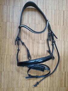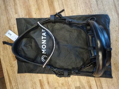 Prachtig zwart Montar Fair hoofdstel. Maat Xfull. Ruim verstelbaar. Heel weinig mee gereden, ziet er uit als nieuw. Lusje van de sperriem kan eraf. Heel zacht onderlegd. Anatomisch kopstuk en aansnoer neusriem. De frontriem is echt prachtig! Is gemakkelijk met een drukknoopje aan en het kopstuk te bevestigen. Met bijbehorend tasje om het hoofdstel in te vervoeren/ bewaren. Nieuw prijs is 139,95.