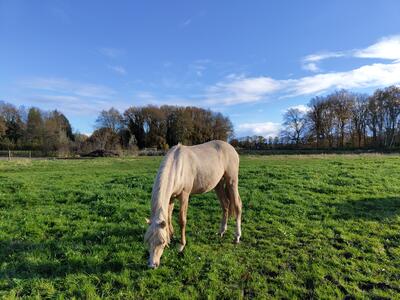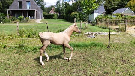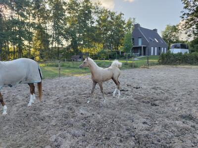 Nieuwsgierige, zelfstandige en dappere merrie met een goede balans en verende gangen. Houdt van poetsen, aandacht en samen wat doen. Palomino met 4 witte benen.Allround E-pony. Bij mij geboren en gezond. Ik fok hobbymatig, daarom nu beschikbaar voor een fijn thuis. Wordt begin mei 3 jaar. 80% arabisch bloed en mooie rechte benen. Predikaatrijke moederlijn met o.a. de top ox hengsten Krimh, Gomel en Baccarat.Braaf bij de smid en loopt netjes mee, ook over balkjes of een zeiltje. Trailer kent ze nog niet maar ik kan haar brengen. Gewend aan 24/7 buiten of 's nachts op stal. Filmpjes beschikbaar op aanvraag.