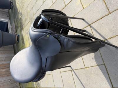 Handgemaakt Hulsebos dressuurzadel. Goed onderhouden, incl singel en beugels, 17" (WB3/4). Met zadelbeschermer en bok om het op te zetten. Altijd goed mee om gegaan./